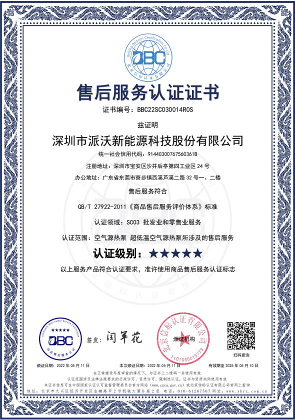 2022年5月,九州酷游空气能售后服务水平达到相应的国家标准,荣获“五星级售后服务认证”