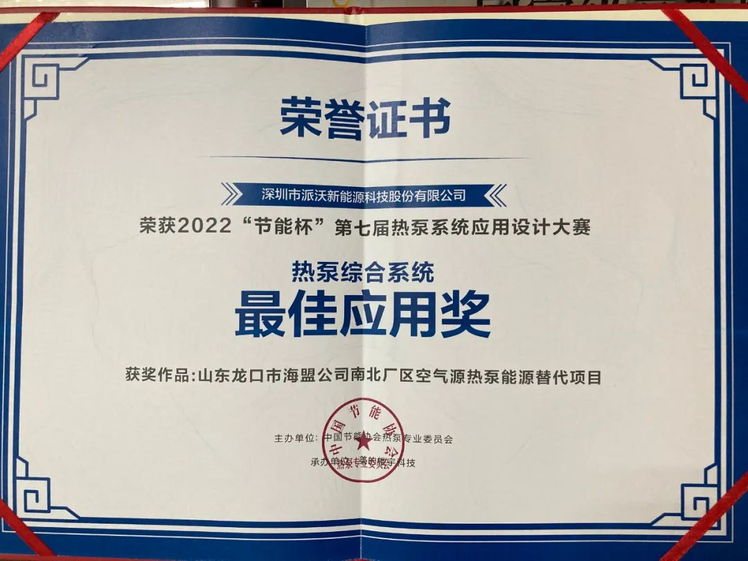 2022年7月27日,荣获2022“节能杯”第七届热泵系统应用设计大赛-最佳应用奖