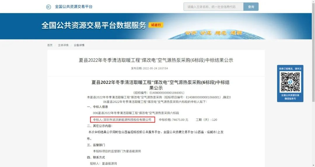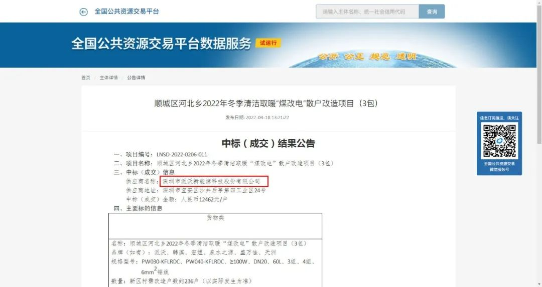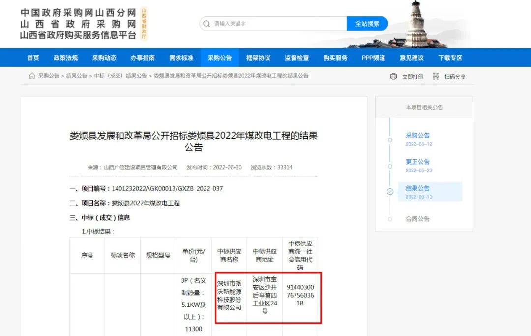 2022年9月,中标山西平陆县2022年冬季清洁取暖“煤改电”项目