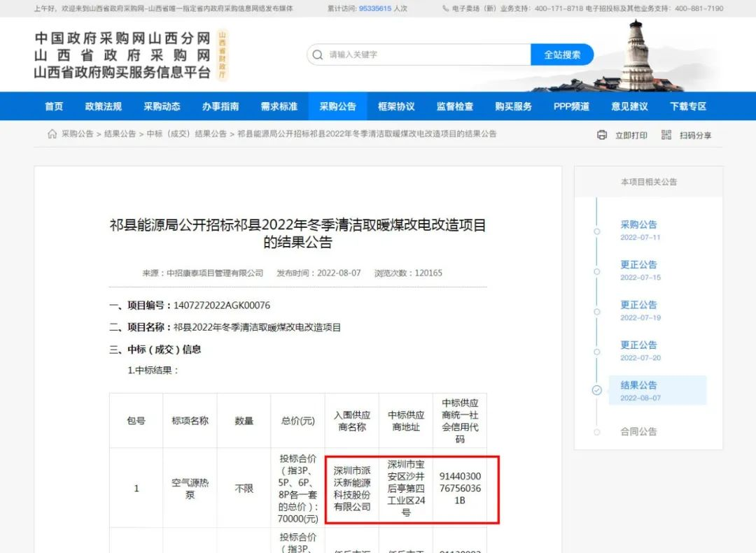 2022年8月,中标山西安泽县清洁取暖“煤改电”设备采购及安装项目
