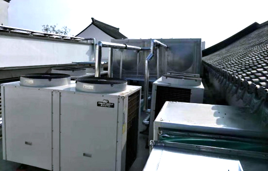 酒店地处无锡惠山脚下,环境保护要求高,由于燃煤锅炉的高污染性,不允许在风景区内有燃煤锅炉的存在。如果改用燃油或燃气锅炉,运行成本过高,不符合经济运行的要求;如果改用电热水炉,需要为此进行配电增容,初始投资及日常的运行费用均高于热泵热水机组。无锡金海花园酒店既是解放军总装备部的无锡接待酒店,又是无锡旅游服务的定点宾馆。使用空气能热水机组不但可以完全满足客房部和餐饮部的需要而且热水量还有富余,即机组的运行时间缩短,不需要连续运行。