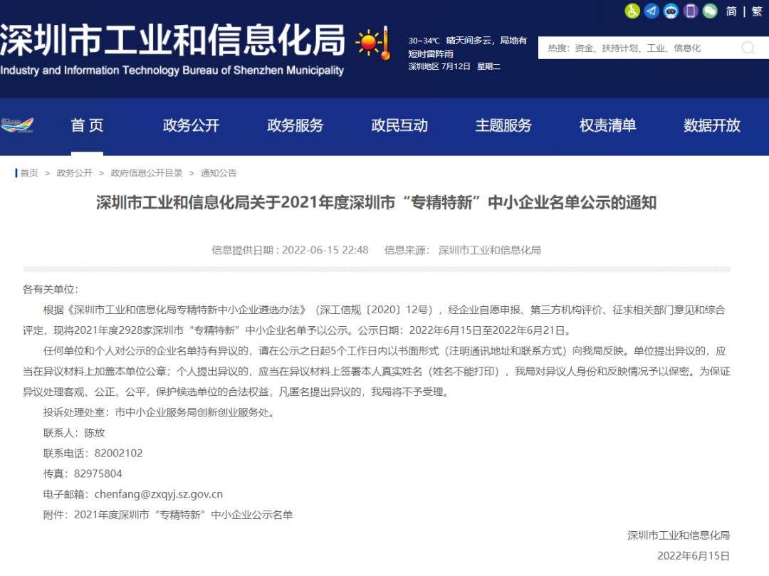 2022年6月15日,深圳市工业和信息化局发布了《深圳市工业和信息化局关于2021年度深圳市“专精特新”中小企业名单公示的通知》,全市共有2928家企业上榜,九州酷游空气能凭借在空气能领域的产品研发实力和技术创新优势光荣上榜,喜获2021年度深圳市“专精特新”中小企业的荣誉称号。