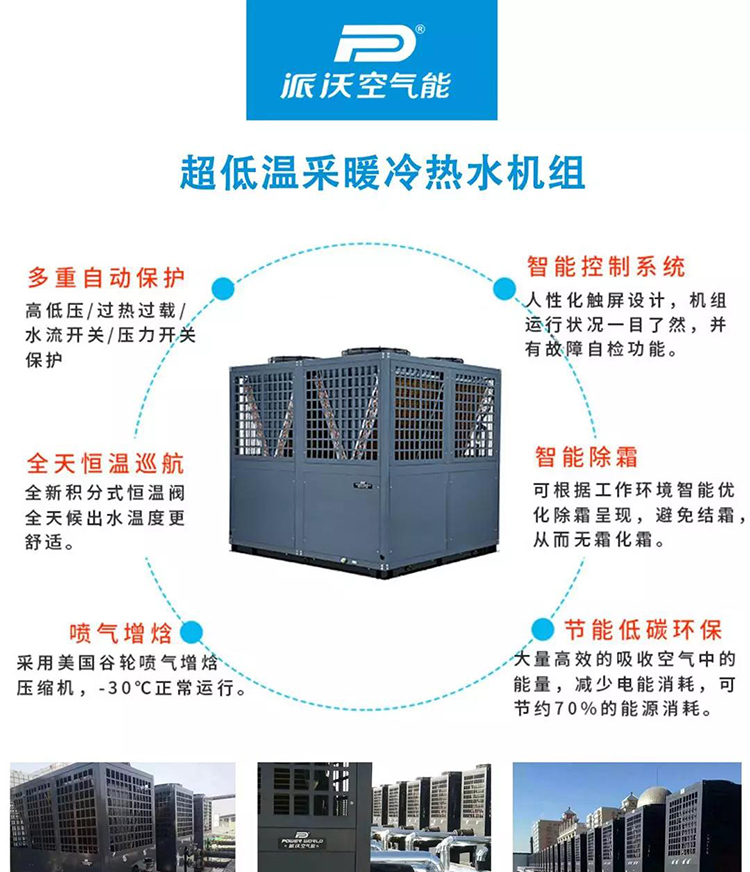 九州酷游拥有智能双超(超低温 -30℃环温产出超高温产热99℃技术)空气能核心技术,其旗下的超低温采暖机组,安装简便,智能除霜。自主控温,制热能效高,在大量的高原地区工程案例中经受住了实践的检验。