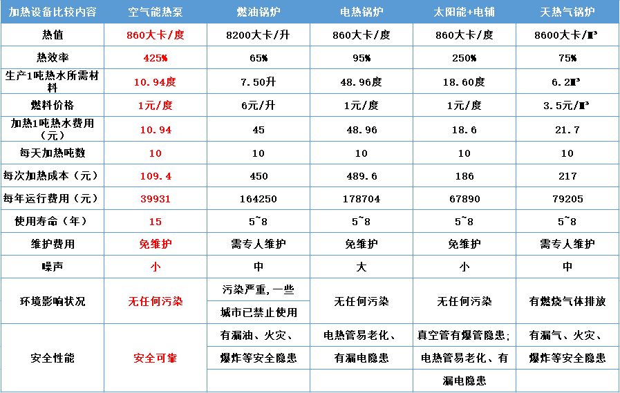 从上图我们可以看到,假设每天消耗10吨热水的费用,空气能热泵只需要成本109.4元,一年运行费用不到4万!
