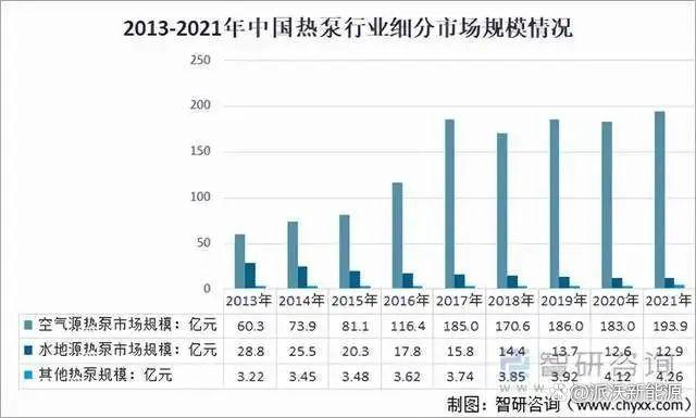 从细分市场来看,目前,空气源热泵仍占据着主导地位。数据显示,2021年我国空气源热泵市场规模193.9亿元,水地源热泵市场规模12.9亿元,其他热泵规模4.26亿元。