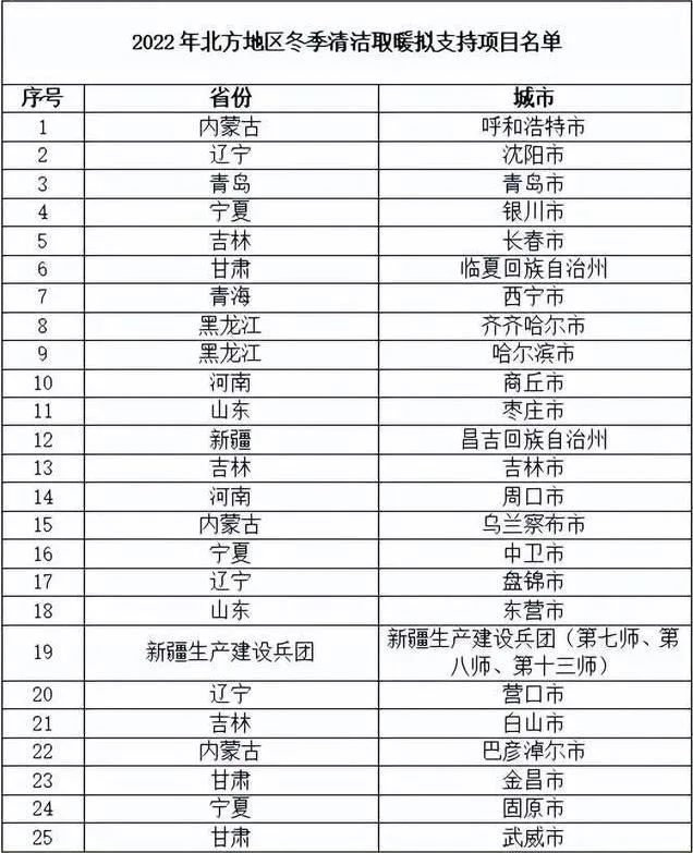 此外,相关部门下发《2022年北方地区冬季清洁取暖拟支持项目名单公示》,其中沈阳、长春、齐齐哈尔、哈尔滨、吉林、盘锦、营口、白山等入围2022北方冬季清洁取暖拟支持名单。