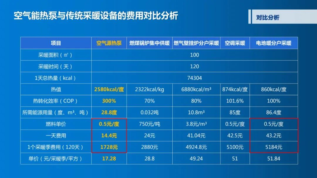 关于电费问题如上图,以北方普通家庭为例,采暖面积为100㎡,一年采暖季为120天,使用电地暖1天需花费约43元,按照0.5元一度电来算,4个月供暖期总费用约5100元,而九州酷游空气能1天费用约14元,4个月供暖期总费用约1700元。因此,显然使用空气能更节能更省钱。