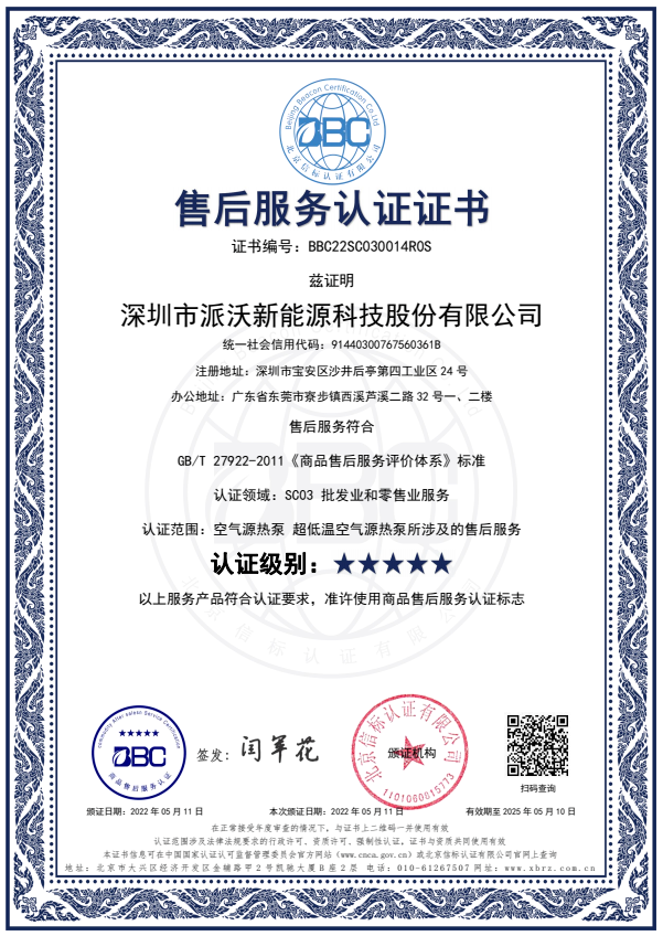 2022年5月,九州酷游空气能售后服务水平达到相应的国家标准,荣获“五星级售后服务认证”