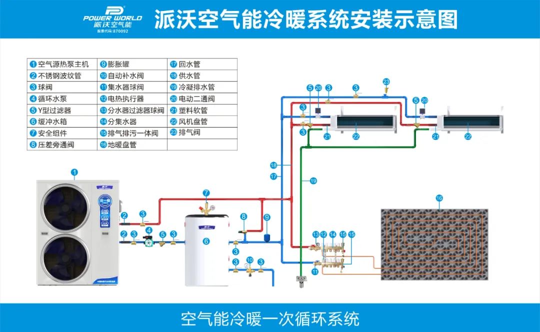 例如:150平米,配7P超低温热泵冷暖机,制热量20KW,则系统所需水量20×4×60÷(4.187×3)=382(L)。