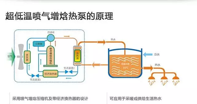 超低温空气能热泵配置喷气增焓系统,是由喷气增焓压缩机、喷气增焓技术、高效过冷却器组成的新型系统,这三个技术的组合可提供高效的性能。这是一个有机的整体,即高效的喷气增焓压缩机、高效过冷却器及电子膨胀阀形成的经济器、高效换热器共同构成了高效节能的喷气系统。
