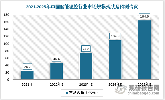 根据观研报告网发布的《中国储能温控行业现状深度研究与发展前景预测报告(2023-2029年)》显示,近年来,在“双碳”战略实施加快、国家相继出台多项政策支持储能产业发展及政策降本增效要求驱动下,我国储能温控行业市场关注度提升,并且价值量将持续提升。根据数据显示,2021年我国储能温控行业市场规模约为24.7亿元(包括出口),预计2025年将增长至164.6亿元,2022-2025年CAGR为52.3%,市场发展空间较为广阔。