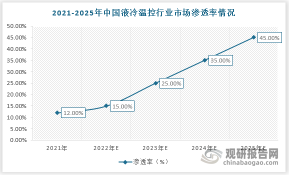 不过,随着充放电倍率的提升、中高功率储能产品的普及,液冷技术研发将不断取得新突破,市场规模及渗透率也将进一步提升。根据数据显示,2021年我国液冷温控行业市场规模约3亿元,预计2025年市场规模将达74.1亿元;渗透率有望由2021年的12%提升至2025年的45%。